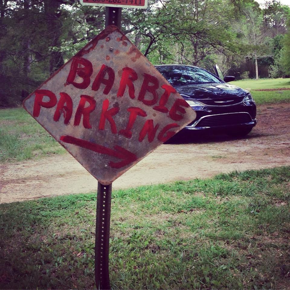 But one day driving aimlessly with the kids trying ourselves entertained, around the backroads near picturesque Senoia GA, home of The Walking Dead, where the entire town is a roadside attraction, and where houses are sold cheap with the understanding that filming can take place anytime, I did a double take and slammed on the brakes as we passed a hand painted sign for Barbie Parking and caught a glimpse of some kind of installation.