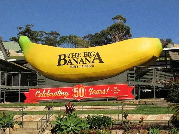 Australia has an unending passion for BIG roadhouse attractions; we have the Big Merino, the Big Prawn, The Big Potato (which looks oddly similar to the Big Submarine) and The Big Banana, among numerous other large installations. There’s nothing quite the feeling of jumping out of your car, roadworn and dusty, and posing for a picture you’ll probably never look at again dwarfed by an obscenely large banana.