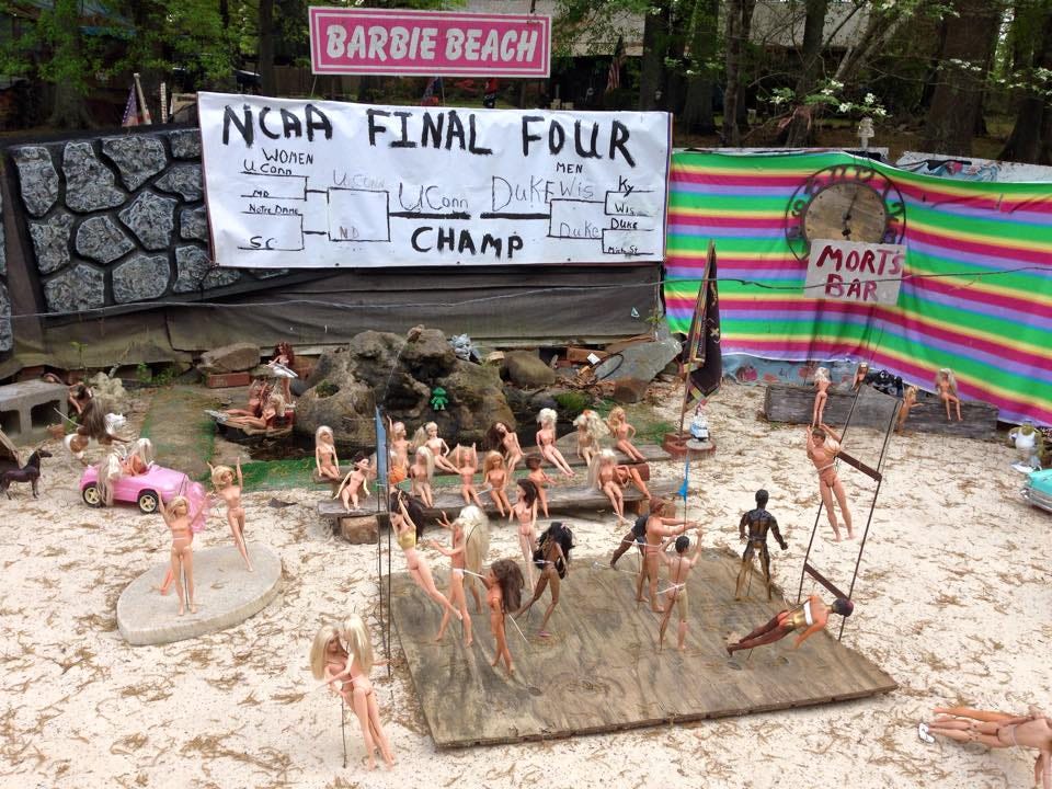 The eye-popping display begun with ‘six nekk-ed Barbies, a ping pong ball and a ping pong net’, inspired by an event where women won the beachball competition in the other Turin, Italy. Its now an ever-changing, always thriving, always nude Barbie Beach Party, where the fun never ends and they all hang out at Mort’s Bar.